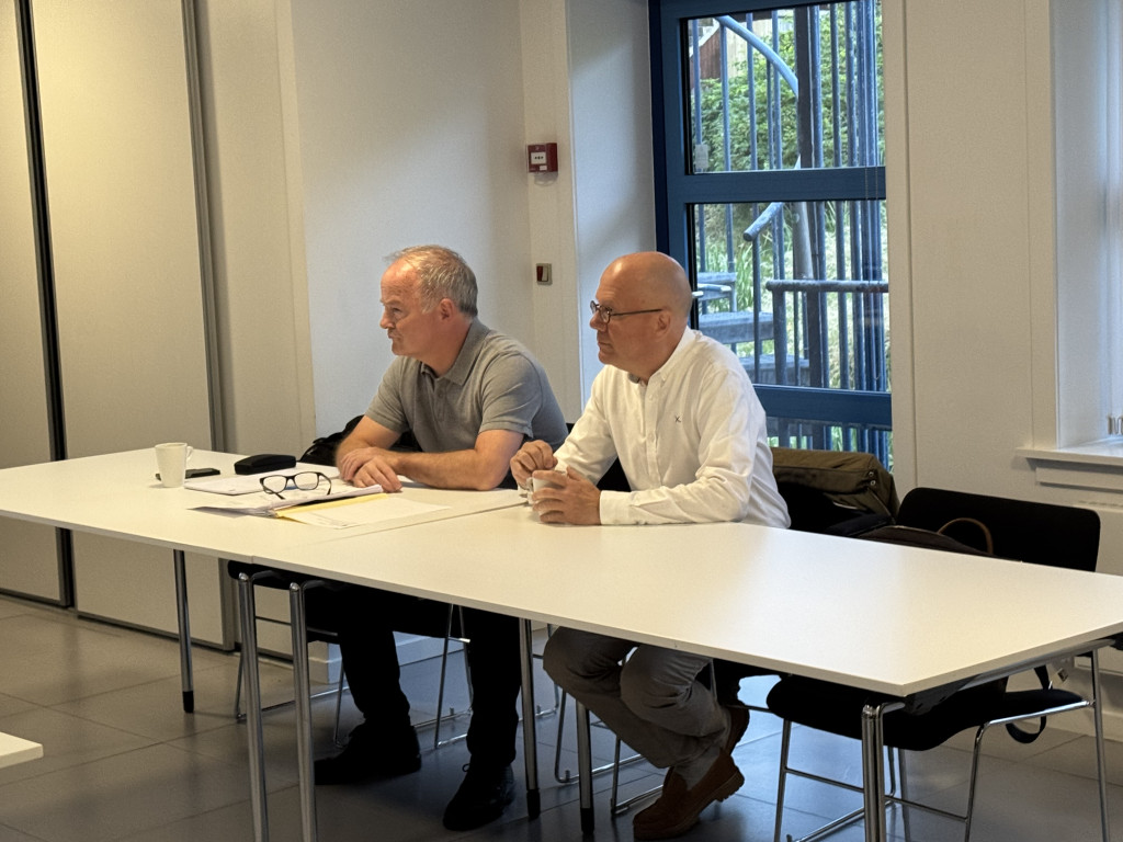 Jógvan E. Ellefsen, advokatur, og Jan Mortensen, stjóri á lønardeildini hjá Fíggjarmálaráðnum á fyrireikandi fundi í Fasta Gerðarrætti mikudagin