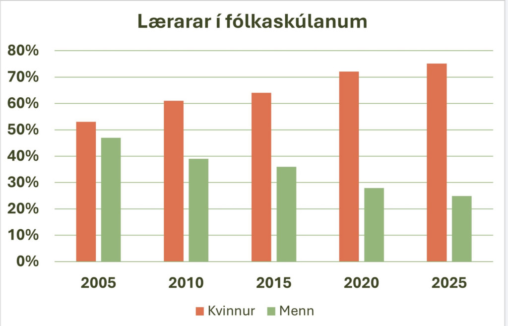 Verða skúlaleiðslur, og ólærdir vikarar taldir við, vóru tað 73 prosent kvinnur og 27 prosent, vóru menn í 2025.