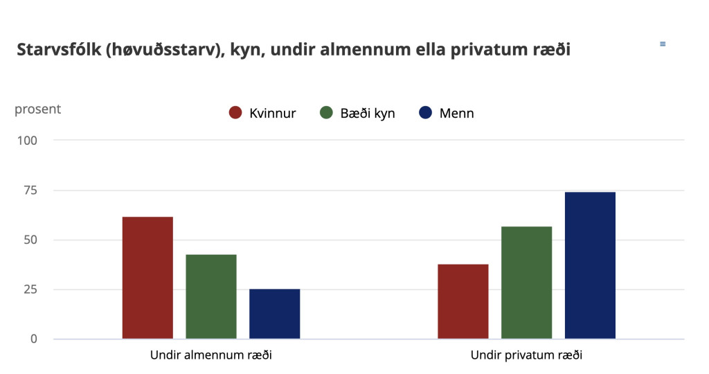 Verður hugt eftir kynsbýtinum, er stórur munur á tí næstan tveir triðingar av kvinnunum arbeiða hjá almennum arbeiðsgevarum av ymsum slagi, men bara ein fjórðingur av almennum starvsfólkum, eru menn.