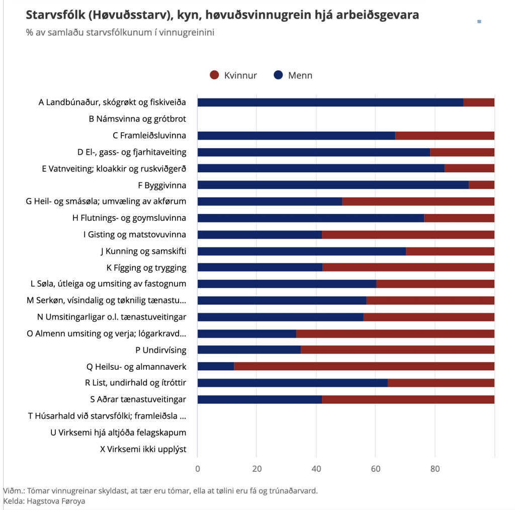 Vinnugreinin, har kynsbýtið er javnast, er í bólkinum »Heil- og smásøla; umvæling av akførum«, har 51 prosent av starvsfólkunum eru kvinnur og 49 prosent eru menn.