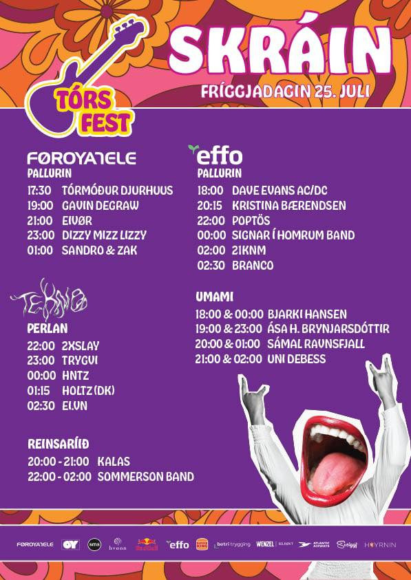 Tormóður Djurhuus byrjar Tórsfest klokkan 17.30, og fram til klokkan 03 í nátt verður Vágsbotnur karmur um heili 11 konsertir á Føroyatele pallinum og Effo pallinum. Eisini vera framførslur í Umami, Perluni og Reinsarínum.