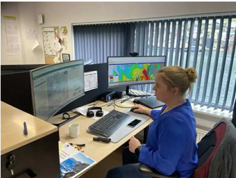 Á Veðurstovu Føroya verður fylgt væl við veðrinum alt árið, ikki minst tá ið djúp lágtrýst við vindi og regni koma hendavegin. Bert lítil broyting í gongdini kann hava stóra broyting í veðrinum við sær. Her situr Turið Laksá, veðurfrøðingur og fyrireikar seg til sjónvarpsveðrið í kvøld. Tey nýggjastu tølini og nýggjastu og forsagnirnar eru á skermunum. Mynd: Hanus Kjølbro.