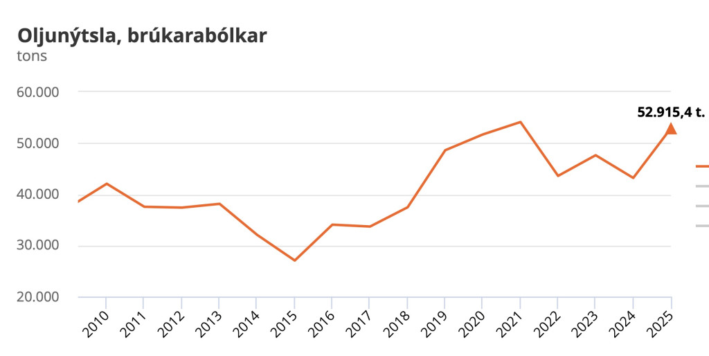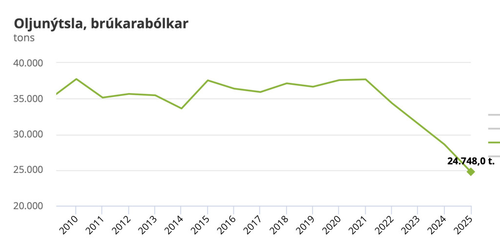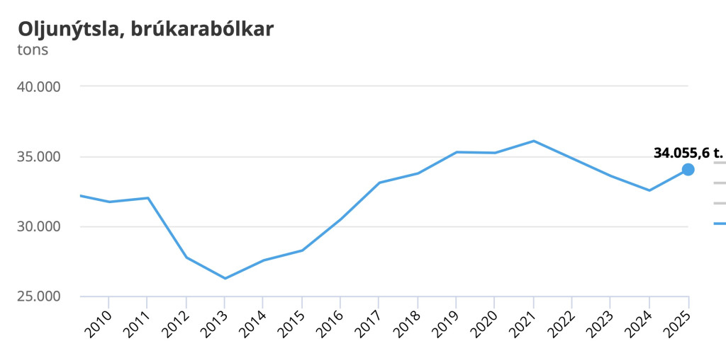 Ein uppgerð hjá Hagstovuni vísir, at í fjør brúktu vit stívliga 306.000 tons av olju, og sum talvan vísir, er tað meiri enn í fjør - og verður serliga hugt eftir teimum seinastu 10 -12 árunum, er oljunýtslan munandi vaksin.