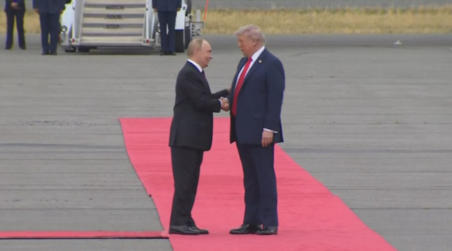 Donald Trump og Vladimir Putin heilsaðu síðani uppá hvønn annan á flogbreytini.