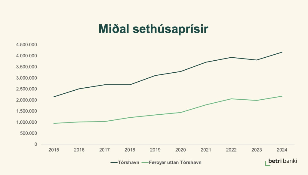 Betri sigur, at í fjør kostaðu eini sethús í Tórshavn 4,2 milliónir krónur í miðal. Tað er níggju prosent meira enn í 2023, tá ið miðalprísurin var 3,8 milliónir krónur