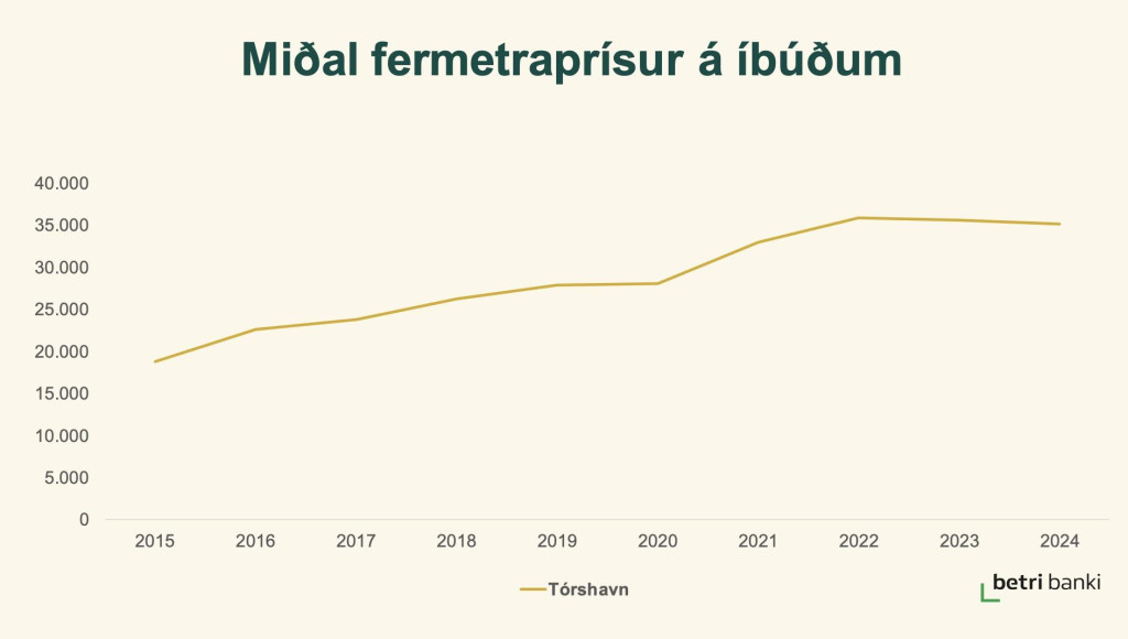 Í fjør kostaði ein íbúðarfermetur 35.100 krónur í miðal. Tað er eitt vet minni enn í 2022 og 2023.